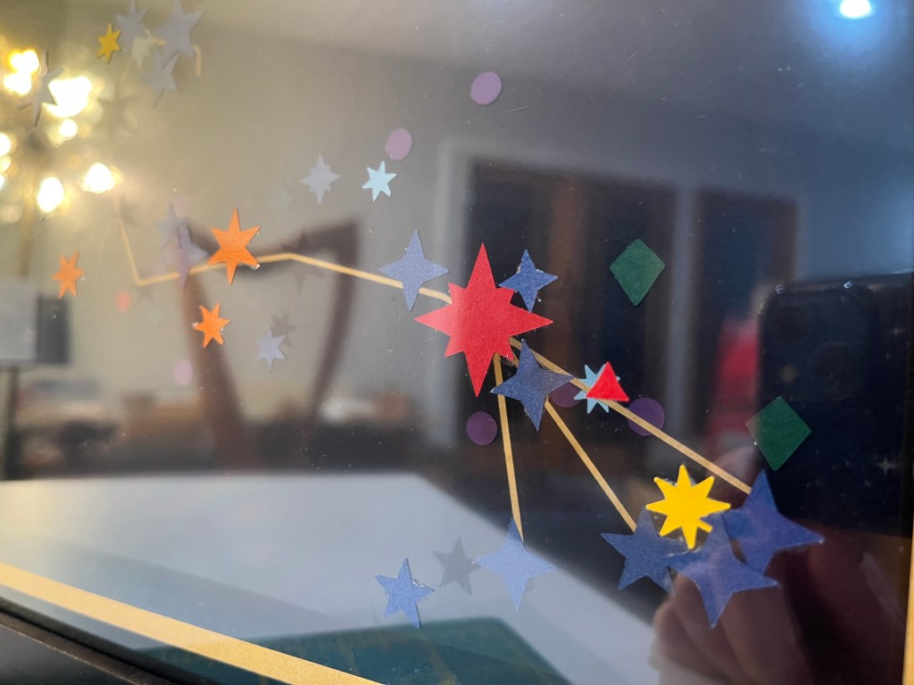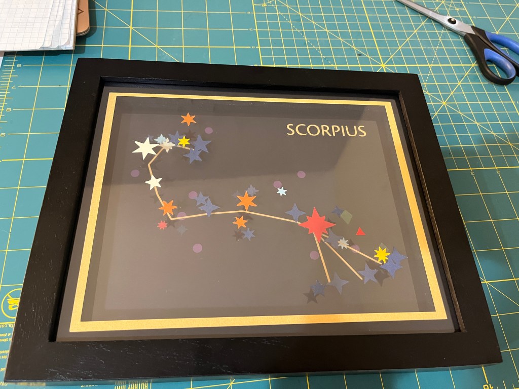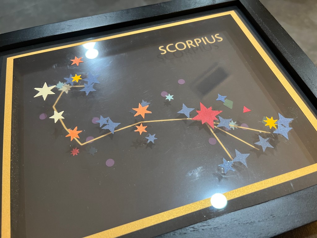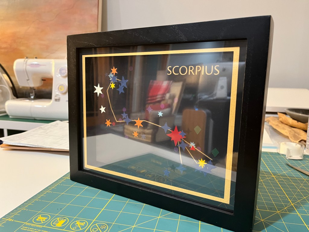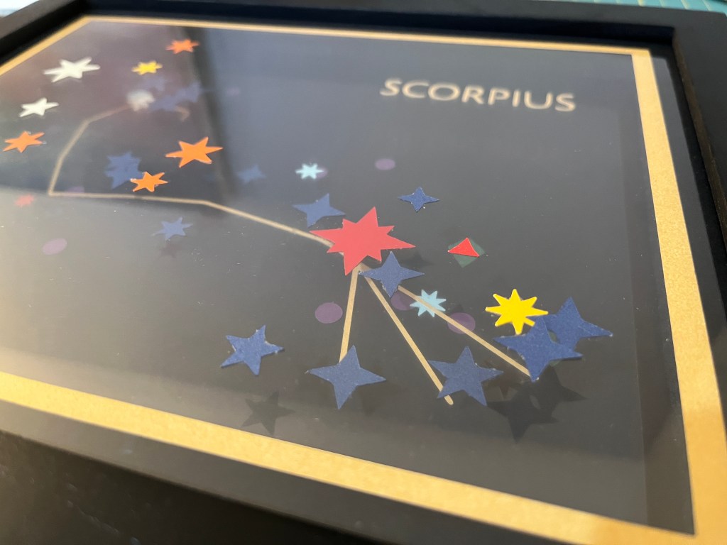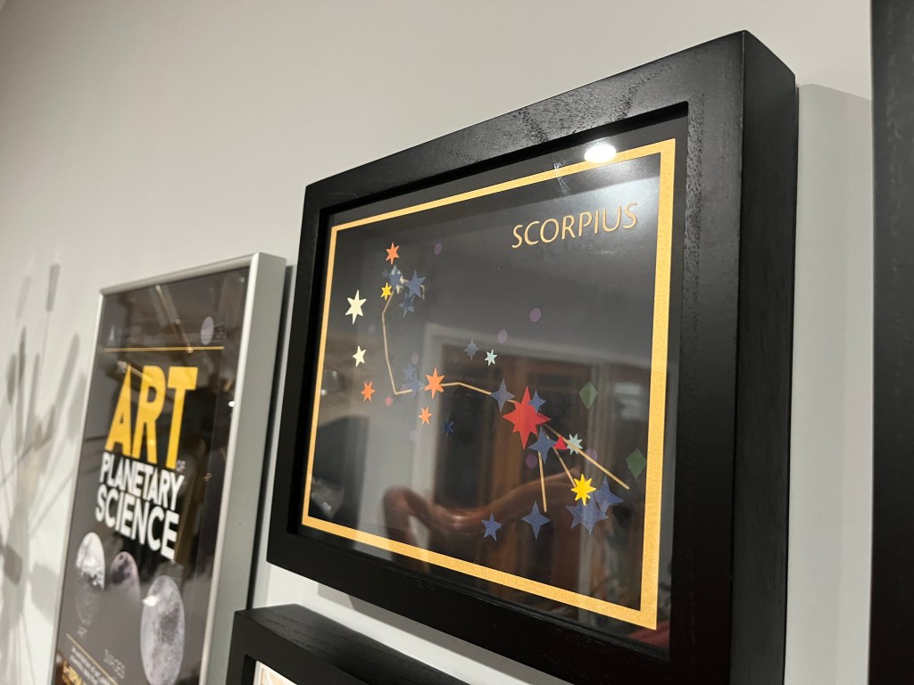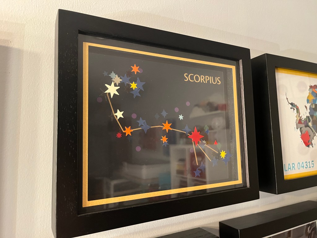 I created this piece as an example for a project in my upcoming workshop on data-driven art, Making Space. The piece features the constellation Scorpius, with its stars represented in paper. The shape temperature of each star is represented by its color, its size the shape, and its magnitude (brightness) in size. Stars are fixed to different layers within the frame according to their distance from Earth, showing the depth of the constellation into the night sky. Unfortunately, it was very hard to photograph due to its multiple reflective layers! But it was fun to make.